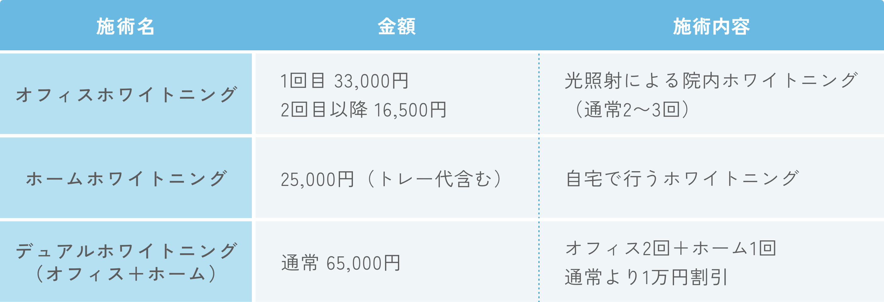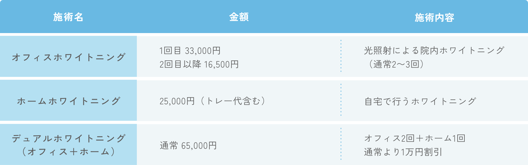 の3種類をご用意し、患者様のライフスタイルやご希望の白さに合わせて最適な方法をご提案しています。